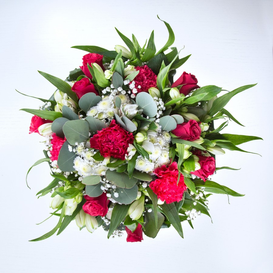 Celebrate beauty with our elegant red and white bouquet. Featuring stunning red roses paired with white chrysanthemums and gypsophila, this arrangement is accented with carnations, white alstroemeria, and aspidistra leaves for a truly unique design.