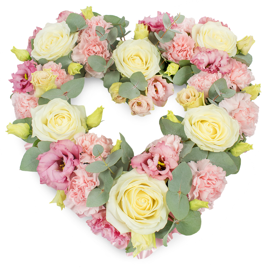 Honor your loved ones with our elegant tribute heart bouquet. This graceful arrangement features a harmonious blend of white roses, pink carnations, exquisite pink lisianthus, and aromatic eucalyptus leaves.